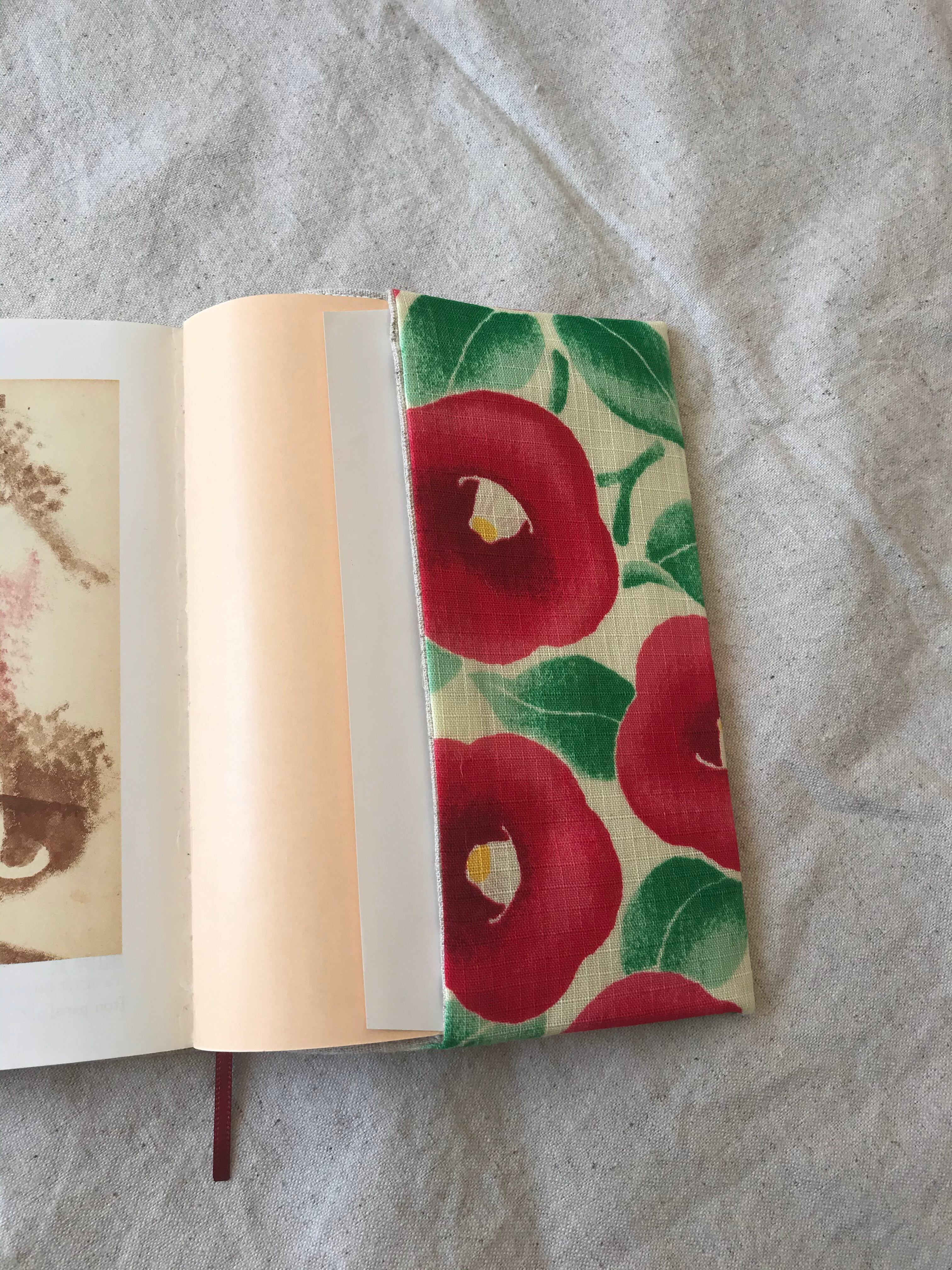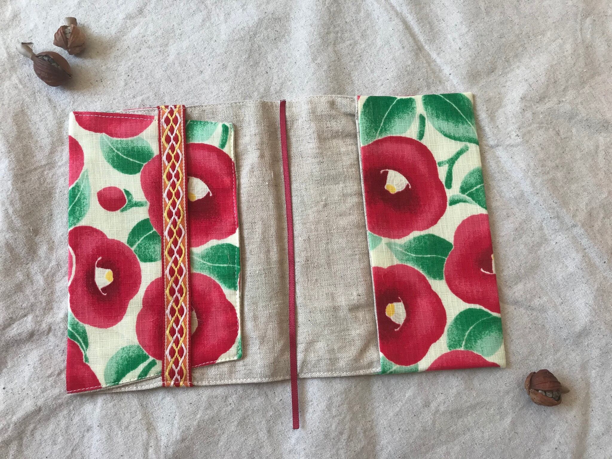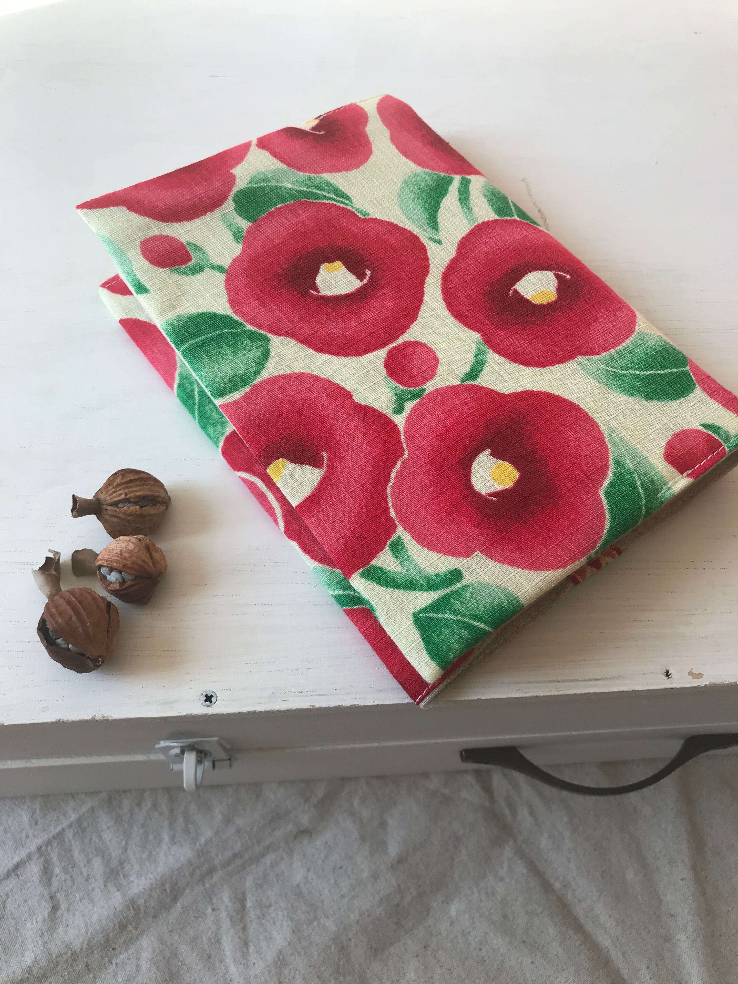 大きな椿の花が着物の柄の様で、和風な雰囲気のブックカバーになりました。
