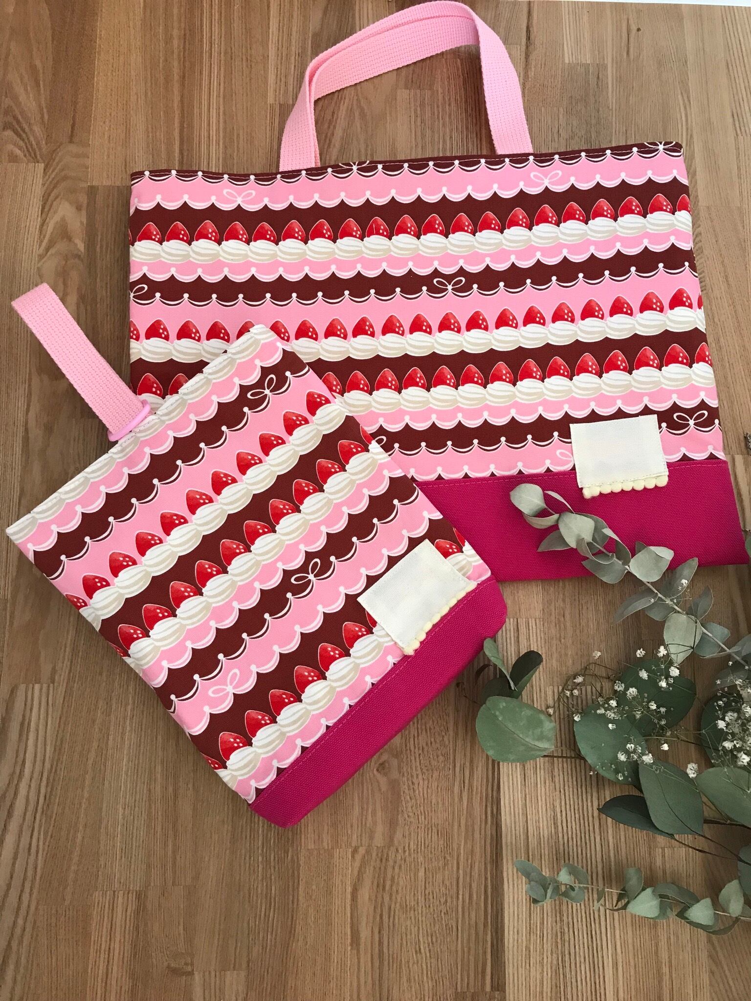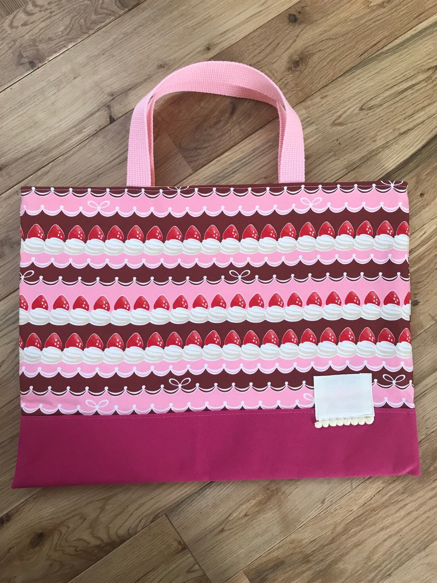 美味しそうなショートケーキ柄のレッスンバッグ、シューズバッグのセットです。