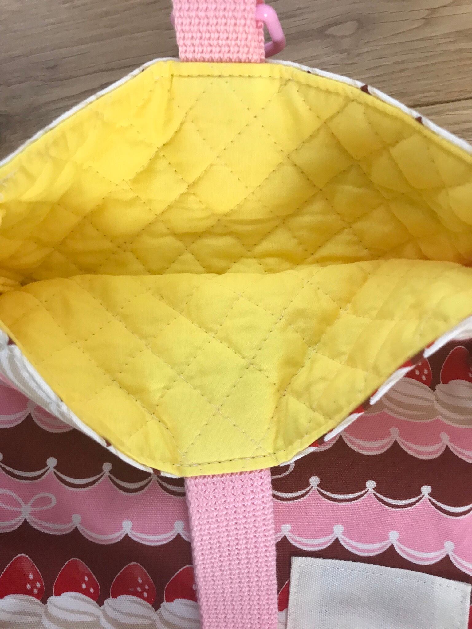 下はピンクの帆布、中布に黄色のキルティング生地を使用して、丈夫に仕立てました。