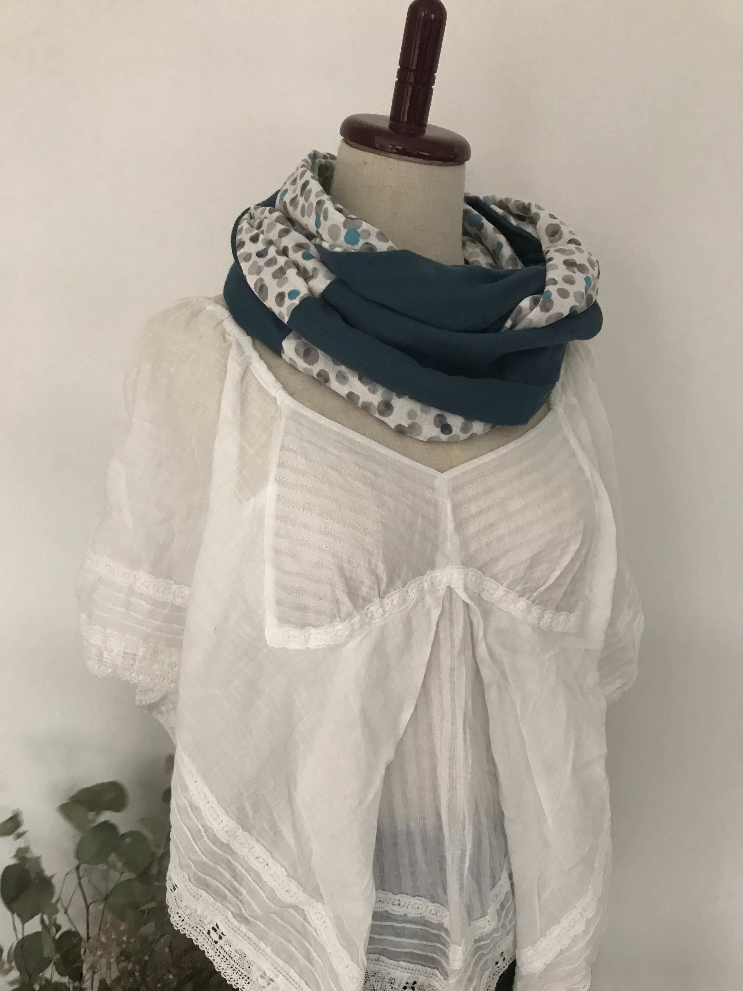 水彩絵の具を落としたような水玉のダブルガーゼと、藍鉄色のダブルガーゼをたっぷりと使ったスヌードです。