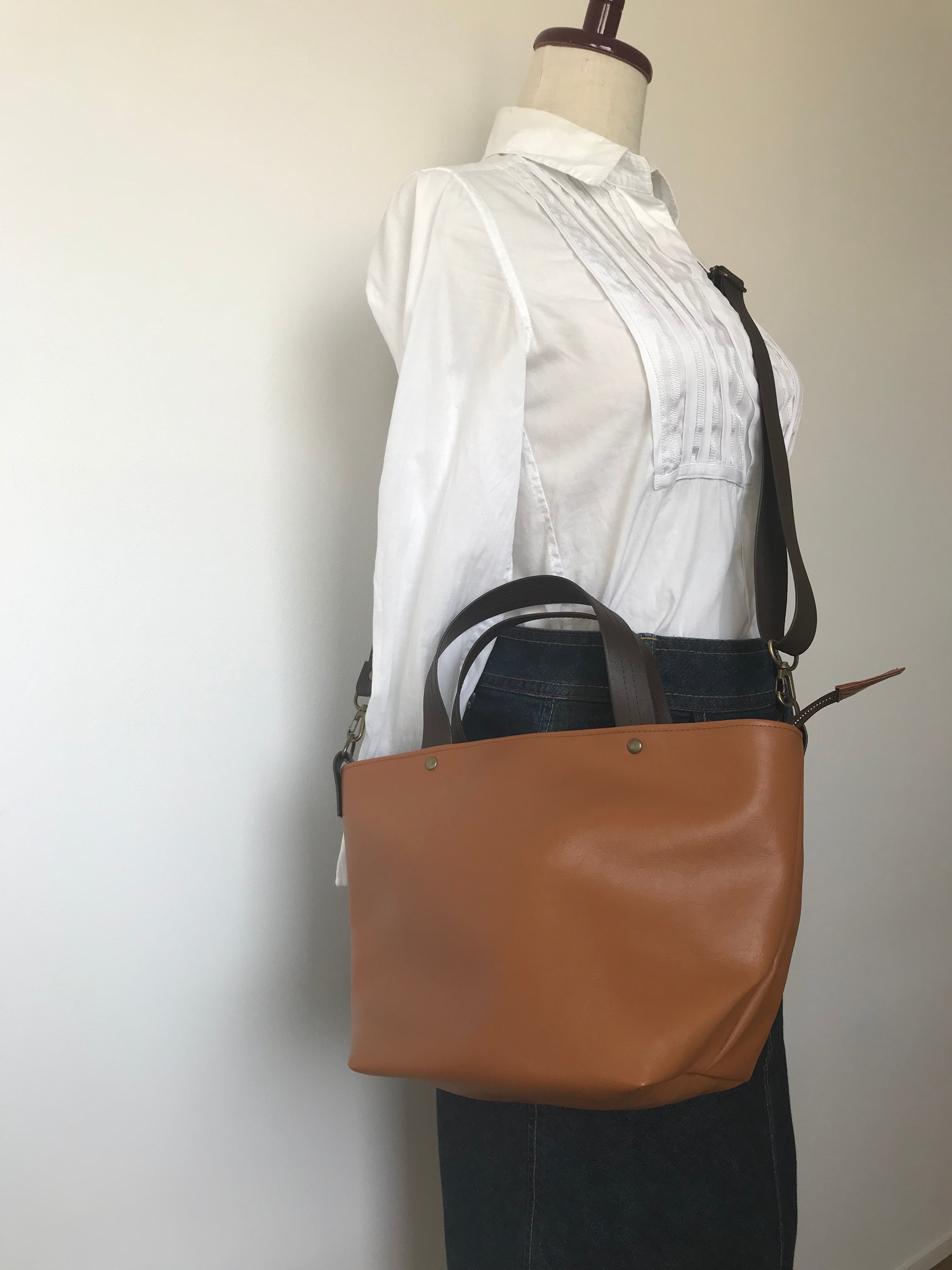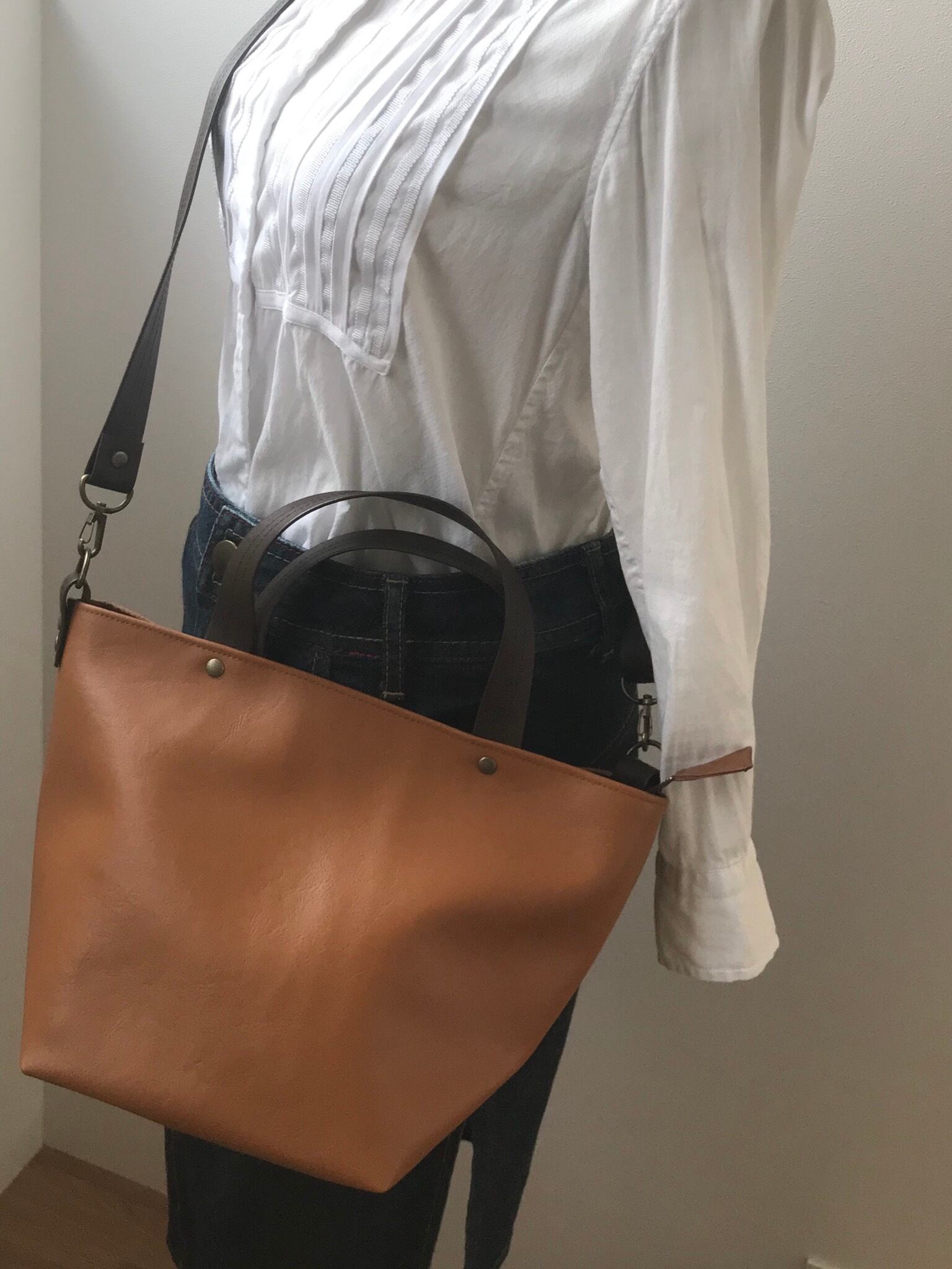 マットなキャメルの合皮で作った、トートバッグとショルダーバッグとしてお使い頂ける2wayバッグです。