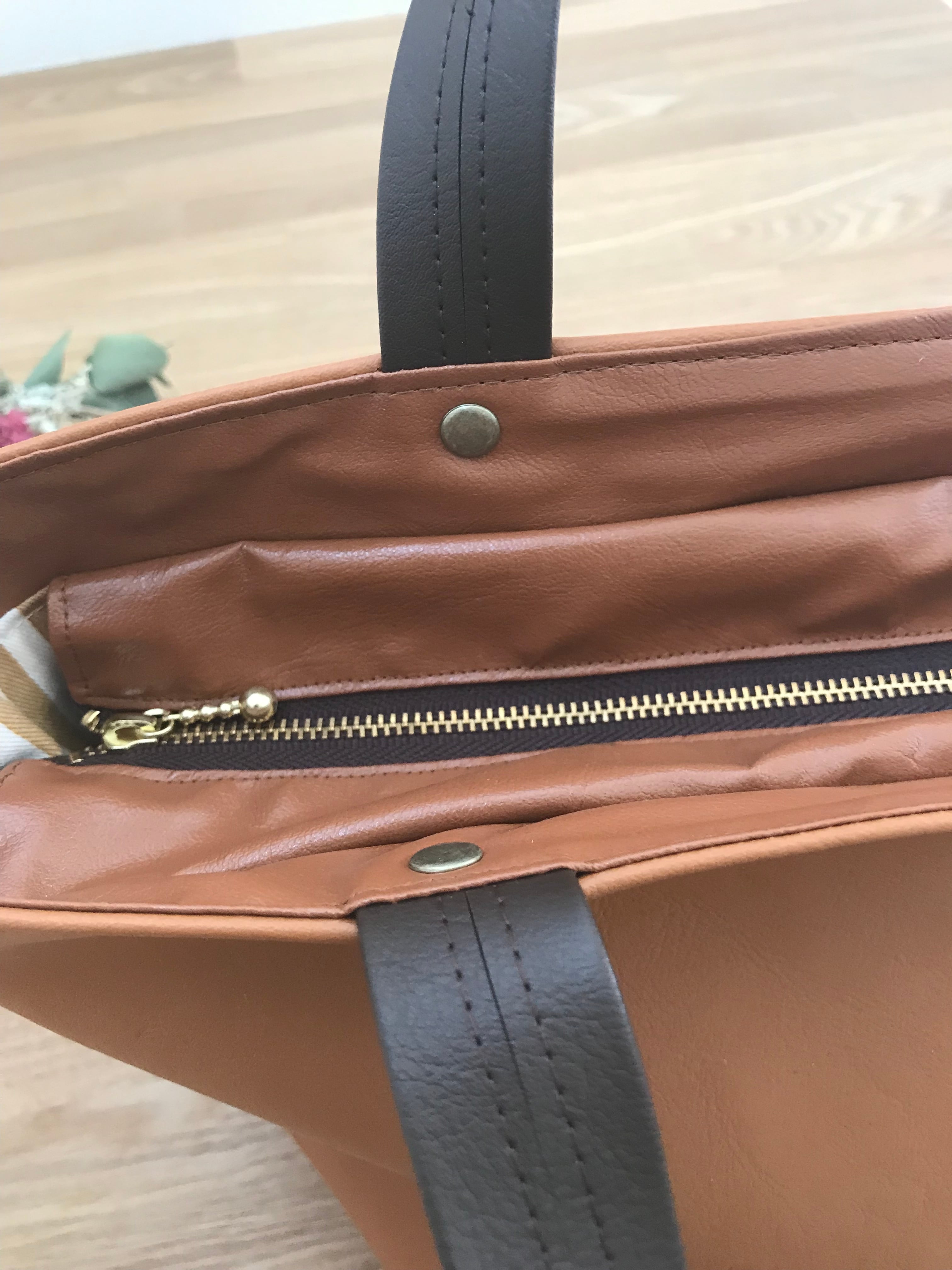 持ち手、ショルダー紐にはダークブラウンの合皮を使用しています。シンプルなバッグですので、季節を問わずお使い頂けます。