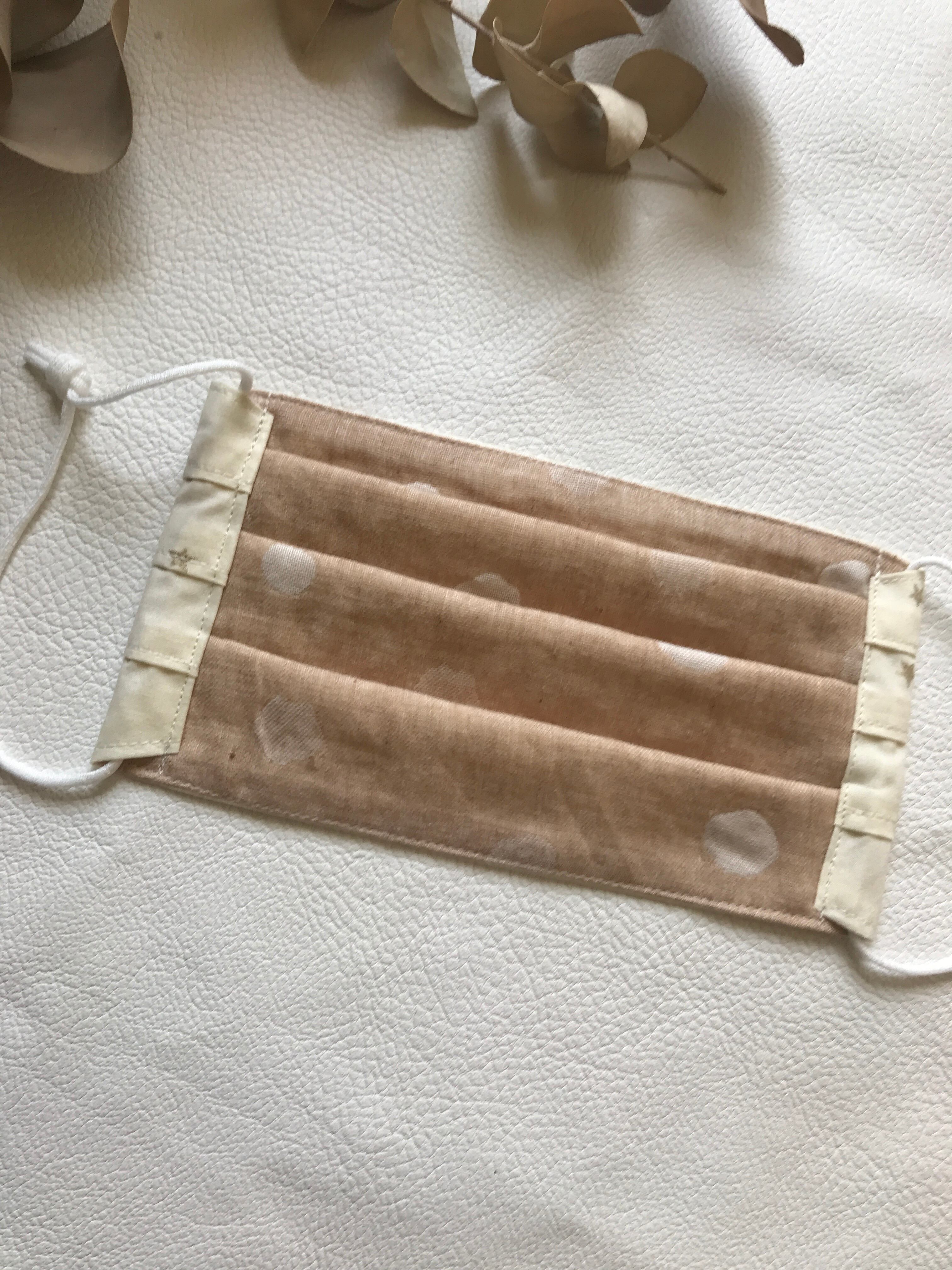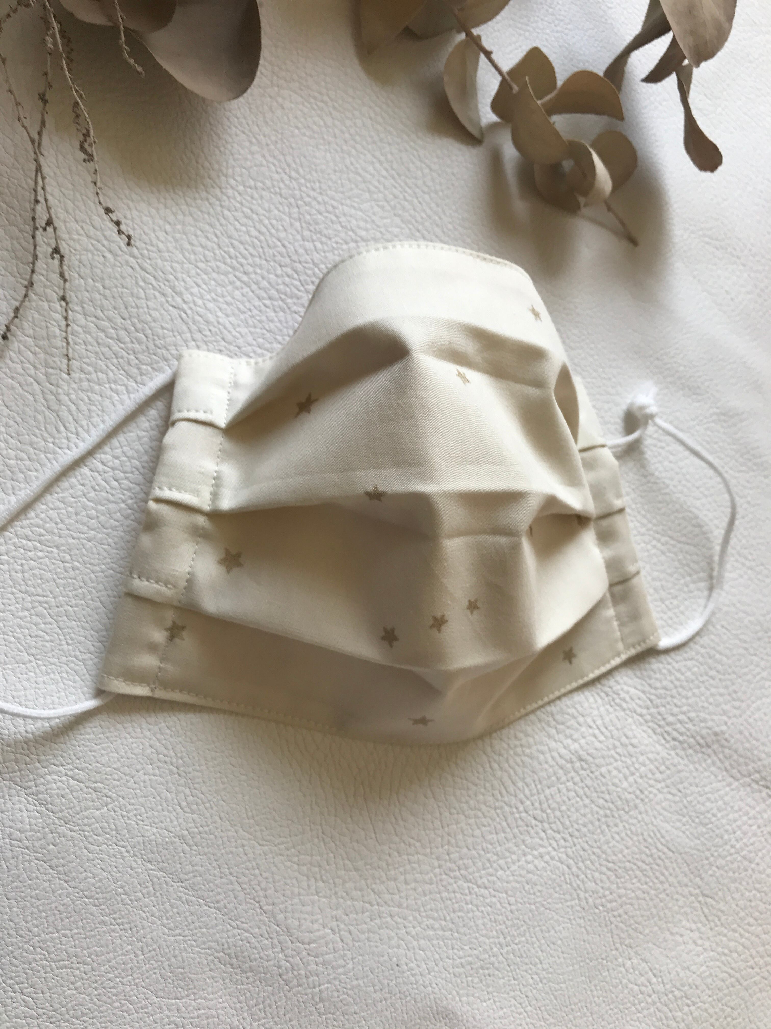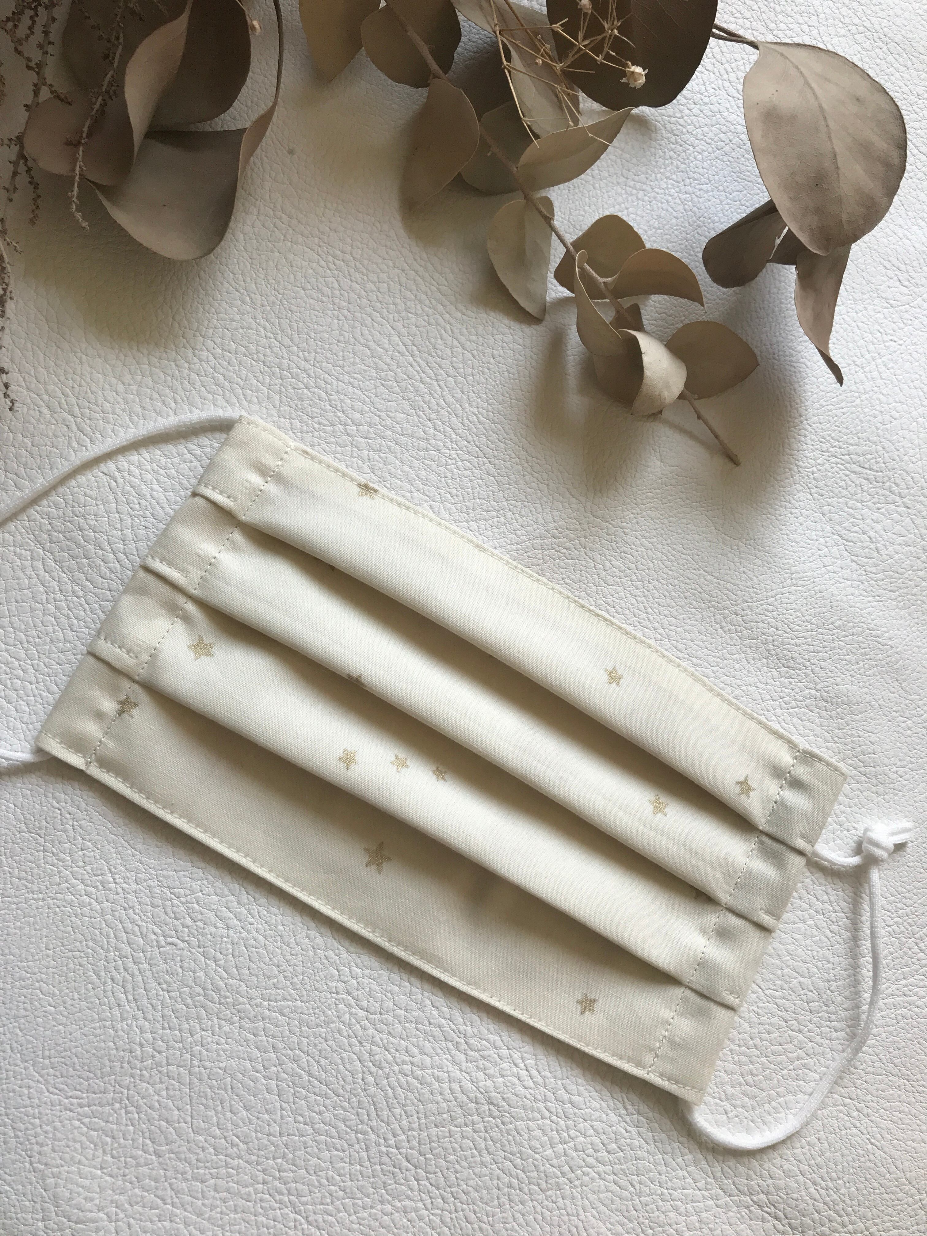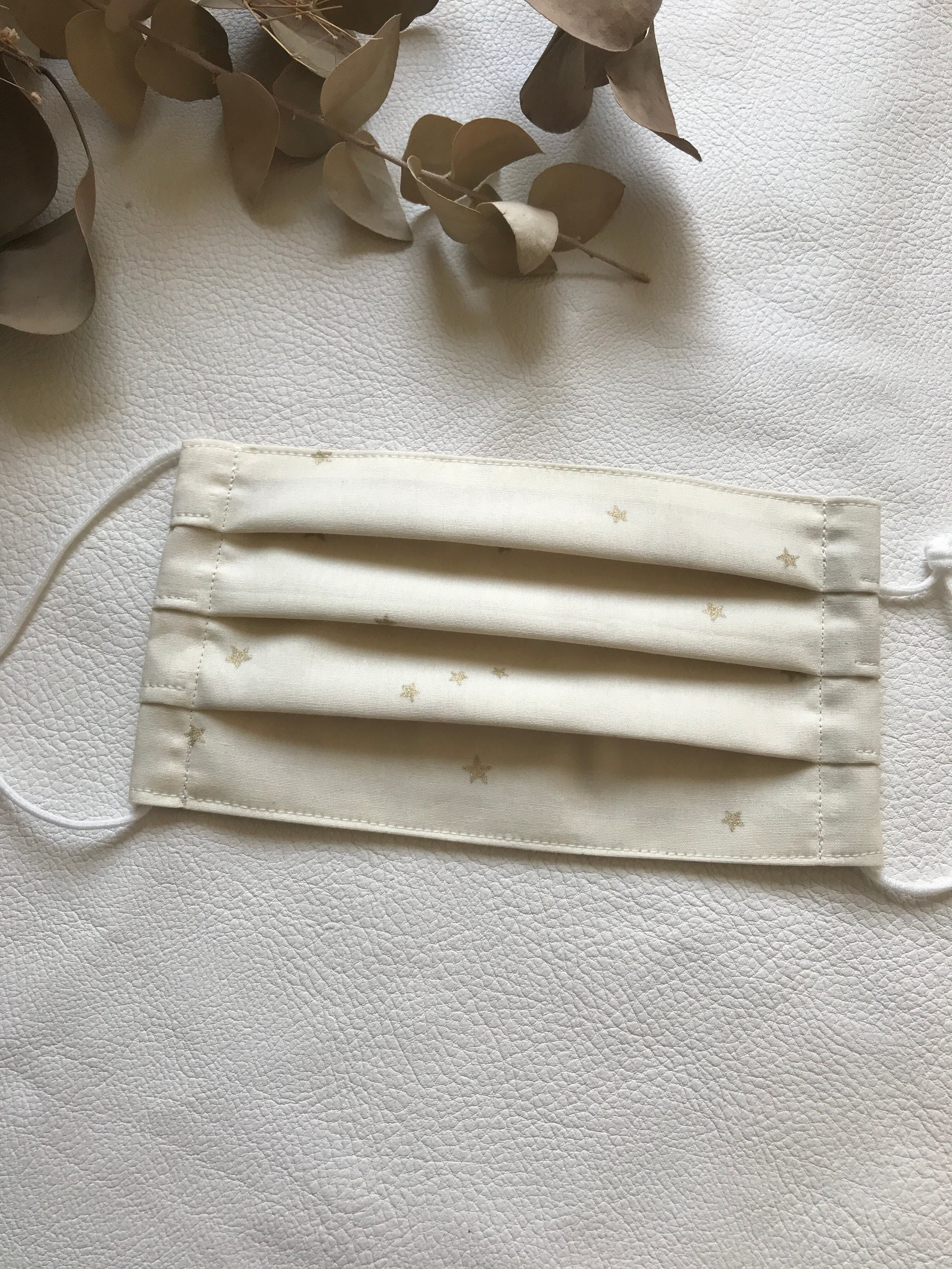 表にコットンのアイボリーにゴールドスターの生地、裏にオーガニックコットンのダブルガーゼを使用したプリーツマスクです。